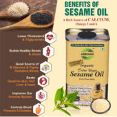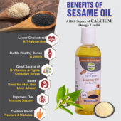 Organic Extra Virgin Cold Press SESAME OIL:- Cold Pressed Virgin Sesame Oil is a highly stable oil due to natural sesmol content. Rich in antioxidants. Good for cooking (sautacing and deep frying). It is said to have a blood pressure lowering effect. Reduces tension and stress by body massage. Product Description Sesame oil (also known as gingelly oil) is an edible vegetable oil derived from sesame(black / white) seeds. It is known as the Queen of Oils.