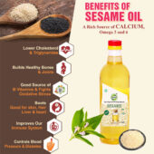 Apart from its uses as cooking oil in all India and it is often used as a flavor enhancer in Chinese, Japanese, Middle Eastern, Korean, and Southeast Asian cuisine dishes. Contains:- minerals such as (rich source of calcium), iron magnesium, iron and copper. Vitamins B6,E, Protiens, Fiber, Zinc,Magnisium anti-oxidants, Omega 3,6, zero cholesterol and zero trans fat. Special feature: it is produce by world latest technology hydraulic cold press technically support by Russian company.